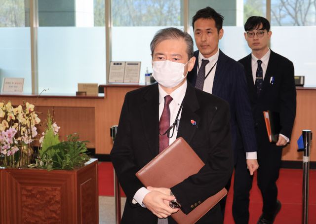 김상훈 외교부 아시아태평양국장은 이날 미바에 다이스케 주한 일본대사관 총괄공사를 초치해 별도로 항의의 뜻을 전달했다. 미바에 공사는 ‘외교청서를 통해 독도 영유권 주장을 반복 중인데 개선할 의지가 있는지’, ‘한일 수교 60주년에 악영향이 있을 것이라고 생각하지 않는지’, ‘수교 60주년을 맞아 전향적인 메시지를 내놓을 생각은 없는지’ 등을 묻는 취재진의 말에 별다른 답을 하지 않고 입장했다.