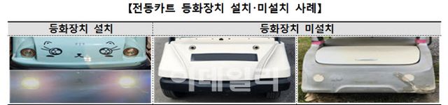 조사대상 전동카트 15대 중 9대는 전조등, 후미등, 제동등, 방향지시등 등 등화장치가 모두 설치됐으나, 나머지 6대에는 등화장치 중 일부가 설치되지 않았거나 고장난 상태였다.