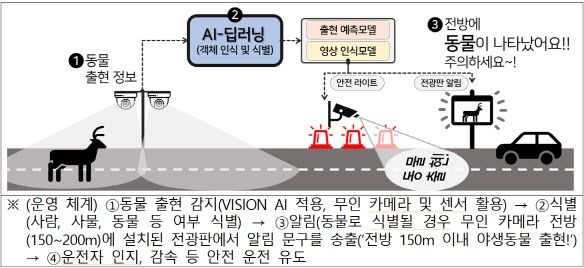 동물 찻길 사고 예방시스템은 인공지능 기술 기반의 폐쇄회로텔레비전(CCTV)과 라이다(LiDAR) 센서를 설치해 동물 출현을 감지하고, 150m 전방에 설치한 발광다이오드(LED) 전광판에 “전방 150m 이내 야생 동물 출현” 문구를 실시간으로 송출하는 시스템이다.