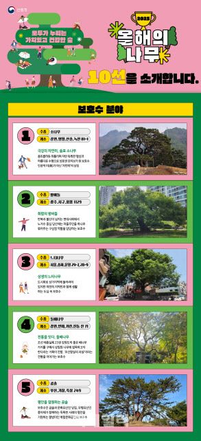 보호수 분야에서는 △강원 영월 소나무 △광주 서구 왕버들 △서울 송파 느티나무 △강원 인제 돌배나무 △부산 기장 곰솔이 선정됐으며, 노거수 분야에서는 △경남 산청 회화나무 △강원 정선 소나무 △전북 고창 이팝나무 △충북 보은 왕버들 △전남 진도 배롱나무가 최종 선정됐다.