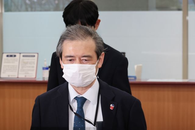 미바에 다이스케 주한일본대사관 총괄공사가 지난달 25일 서울 종로구 정부서울청사 외교부로 초치되고 있다. / 연합뉴스