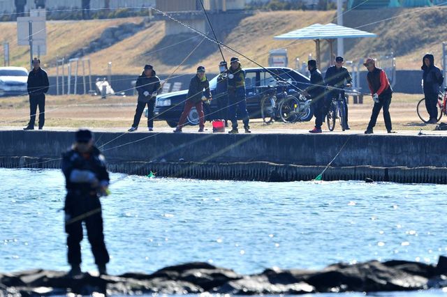 2016년 2월 17일 오후 경북 포항시 북구 송도동 형산강 하류에서 강태공들이 훌치기 낚시로 제철을 맞은 숭어 잡이를 하고 있다 / 뉴스1