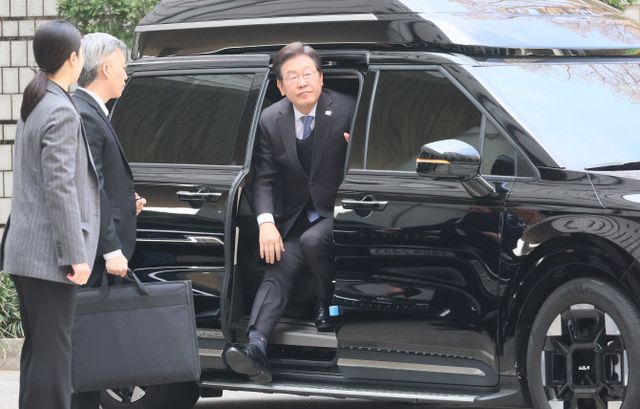 이재명 더불어민주당 대표가 8일 서울 서초구 서울중앙지법에서 열린 '대장동 배임·성남FC 뇌물' 1심 속행 공판에 출석하기 위해 차에서 내리고 있다. ⓒ 연합뉴스