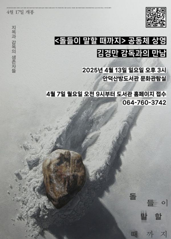 제주특별자치도 서귀포시 안덕면에 위치한 안덕산방도서관에서 오는 13일 4.3 다큐멘터리 영화, '돌들이 말할 때까지' 상영회가 개최된다.