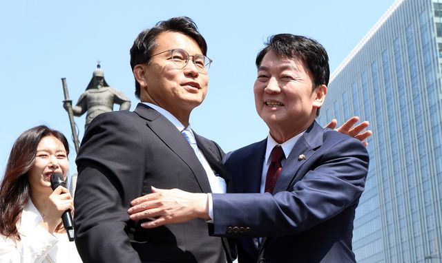 안철수 국민의힘 의원이 8일 서울 광화문 이순신 동상 앞에서 제21대 대통령 선거 출마 기자회견 중 윤상현 국민의힘 의원의 응원을 받고 있다. 왼쪽에 있는 여성이 출마 선언식 사회를 맡은 이효진 대변인이다. / 뉴스1