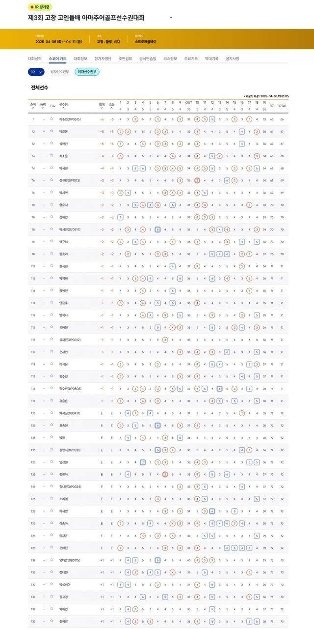 ▲제3회 고창 고인돌배 아마추어선수권 1라운드 순위(여자선수권부)