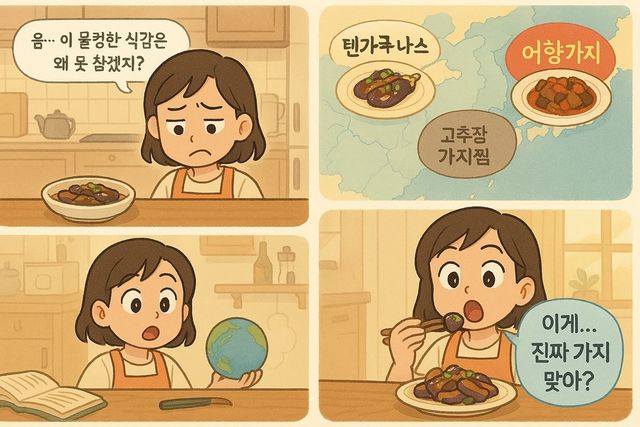 한국에서 호불호 갈리는 식재료 '가지'에 대한 AI 생성 웹툰