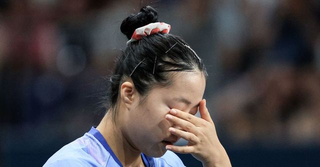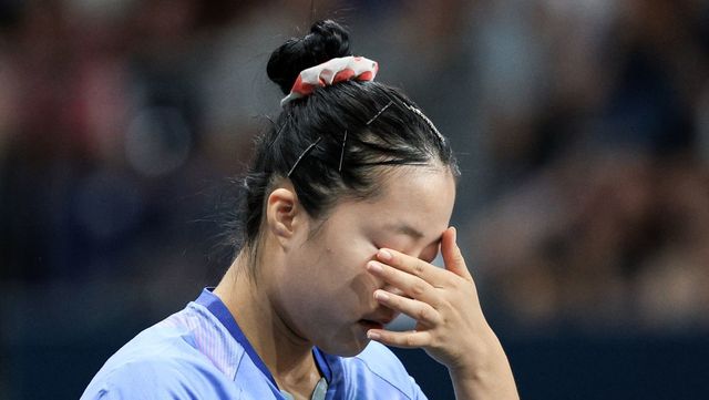 대한민국 탁구 대표팀 신유빈 선수가 지난해 8월 1일 오전(한국 시각) 프랑스 파리 사우스 파리 아레나 4에서 열린 '2024 파리올림픽' 탁구 여자 단식 16강 미국의 릴리 장 선수와의 경기에서 눈가를 만지고 있다. / 뉴스1