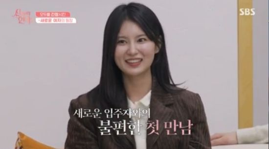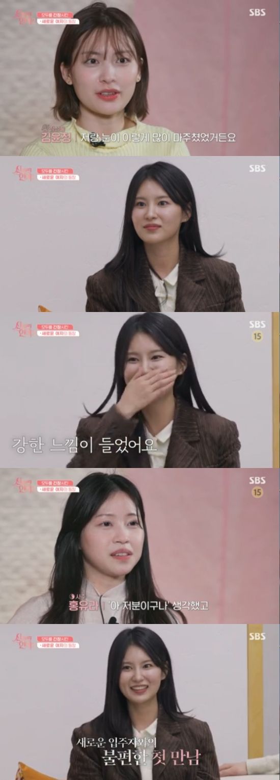 김윤정은 이경언을 보자마자 "너무 예쁘시다. 내가 반했다"면서 반겼고, 이경언은 어색한 분위기 속에서도 자연스럽게 웃으면서 여유를 찾으려고 했다.