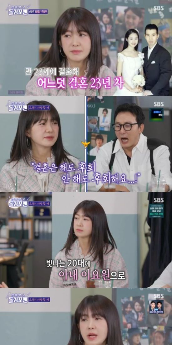 이요원은 어린 나이에 남편과 결혼을 결심한 계기에 대해 "결혼은 해도 후회, 안 해도 후회인 것 같다. 저도 결혼까지 할 생각은 없었다. 제가 일찍 데뷔를 해서 사람들에 상처를 많이 받았다. 사람에 질렸었다. 그 때 만난 사람이 남편이다. 타이밍이 그렇게 됐다"고 설명했다.
