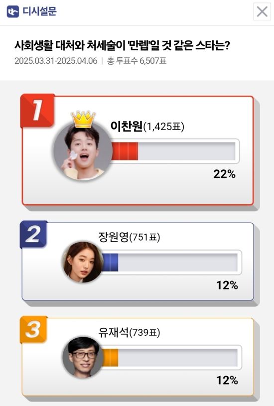 디시설문 갤러리는 지난 3월 31일부터 4월 6일까지 진행된 설문조사에서 이찬원이 "사회생활 대처와 처세술이 '만렙'일 것 같은 스타" 1위로 선정됐다고 밝혔다. 그는 총 6,246표 중 1,425표(투표율 약 22%)를 얻어 1위에 올랐다.