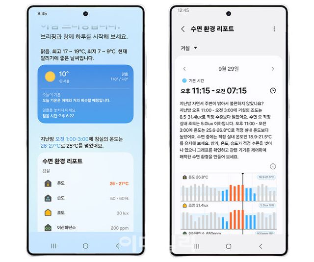 스마트싱스는 온도, 습도, 이산화탄소 농도, 조도 등 수면에 영향을 줄 수 있는 요소들을 연결된 기기와 센서를 통해 모니터링하고 제어해왔다. 올해 초 도입된 ‘수면 환경 리포트’를 통해 사용자에게 지난밤 수면 환경을 요약해 보여주고 쾌적한 수면을 위한 개선 방안도 제안한다.