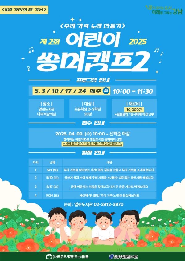 강남구립열린도서관은 5월 가정의 달을 맞아 오는 5월 3일부터 ‘어린이 쏭머캠프2 – 우리 가족 노래 만들기’ 프로그램을 진행한다.