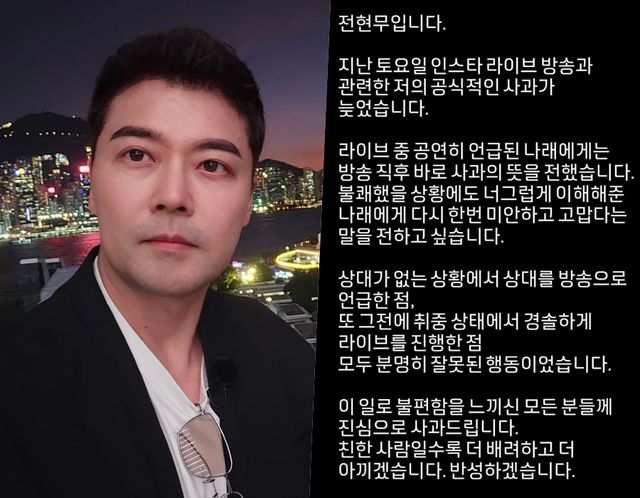 전현무는 끝으로 "이 일로 불편함을 느끼신 모든 분들께 진심으로 사과드립니다"라며 "친한 사람일수록 더 배려하고 더 아끼겠습니다. 반성하겠습니다"라고 사과했다.