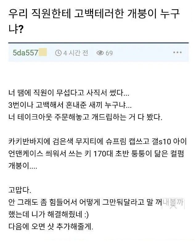 우리 카페 직원한테 고백테러한 사람 누구냐?