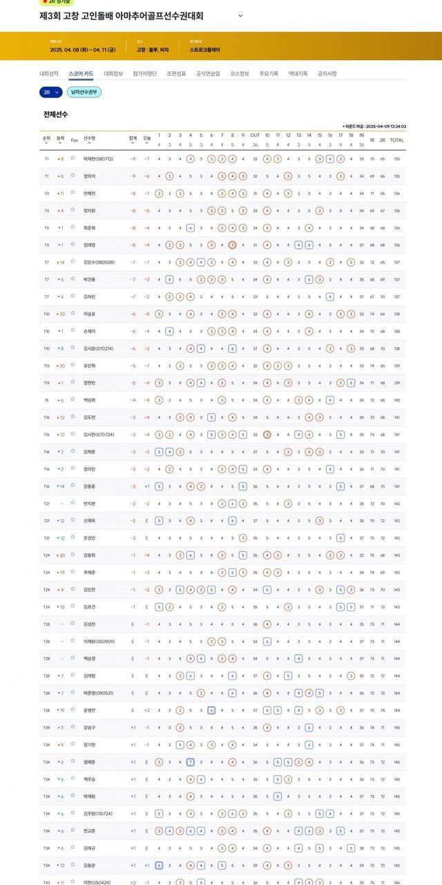 ▲제3회 고창 고인돌배 아마추어선수권 2라운드 순위(남자선수권부)