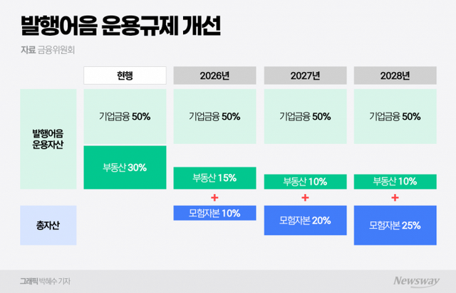 금융위는 지난해 9월 말 종투사 4사의 발행어음 조달액 대비 총자산 중 모험자본 비율이 11.3%~27%라는 점을 감안, 모험자본 공급의무 비율을 내년 10%에서 2027년 20%, 2028년 25%로 단계적 상향할 방침이다. 부동산 운용 한도의 경우 현 30%에서 내년 15%, 2027년 10%로 하향한다. 또한 발행어음을 금융소비자보호법상 투자성 상품으로 열거해 판매규제도 강화한다.