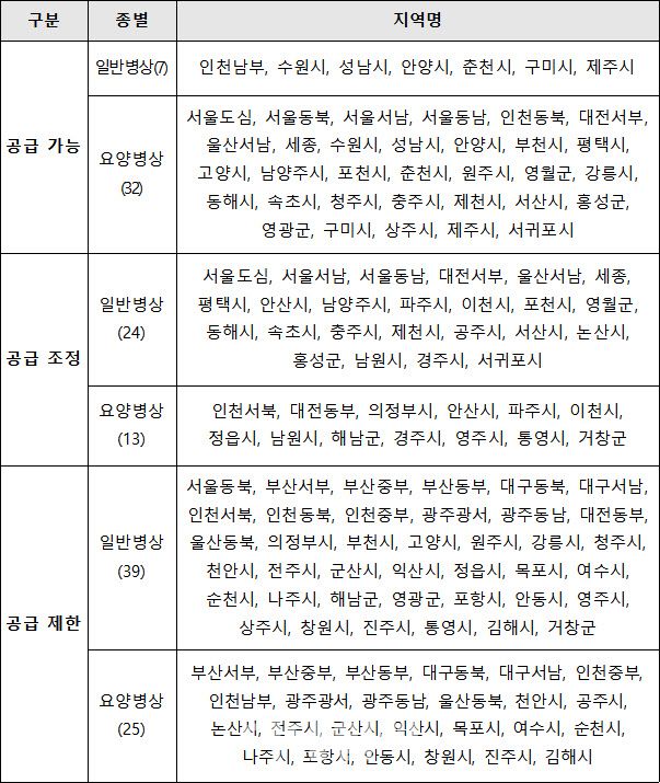 이렇게 공급이 제한되는 지역은 일반병상 기준 63개, 요양병상 기준 38개 지역이 포함됐다. 공급 가능지역은 병상 수요 대비 병상 공급이 부족한 지역으로, 일반병상 기준 7개, 요양병상 기준 32개 지역이 해당한다. 해당 지역은 목표 병상 수까지 신·증설이 가능하다.