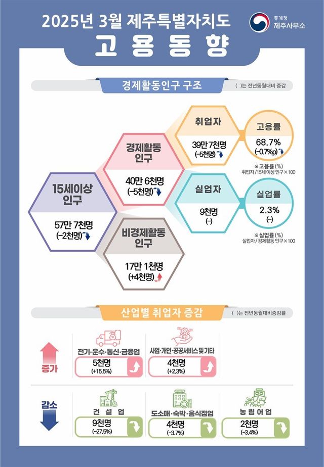 통계청 제주사무소가 9일 발표한 '2025년 3월 제주특별자치도 고용동향'에 따르면 지난달 제주지역 건설업 취업자는 2만3000명으로 전년 동월(3만2000명) 대비 27.5%(9000명) 급감했다.