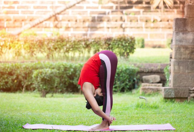 허리를 숙여 손바닥을 바닥에 대고, 다리를 뻗어 엉덩이를 하늘로 향하게 한다. 이 자세는 햄스트링과 척추를 스트레칭한다.