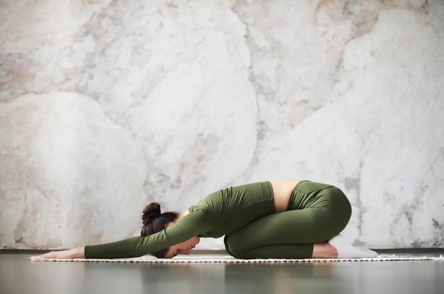 무릎, 가슴, 턱을 바닥에 내리며 자세를 낮추고 천천히 호흡한다. 상체를 쉬게 하는 자세다.