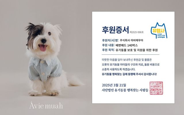 이번 기부는 단순한 후원을 넘어 반려동물과 함께하는 삶의 가치를 공유하며 사회적 책임을 실천하고자 진행됐다. 기부 물품은 아비에무아가 지난해 국제 강아지의 날을 기념해 선보인 한정판 반려견 의류 라인업 ‘펫 캡슐 컬렉션’의 판매 수익금으로 마련됐다. 아비에무아는 유기견들의 일상에 실질적인 도움이 될 수 있도록 배변패드를 기부 물품으로 선정해 전달했다.