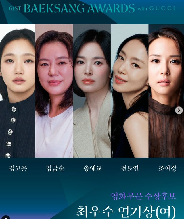 영화 부문 여자 후보에는 '대도시의 사랑법' 김고은, '정순' 김금순, '검은 수녀들' 송혜교, '리볼버' 전도연, '히든 페이스' 조여정이 올랐다. 남자 후보로는 '아침바다 갈매기는' 유주상, '승부' 이병헌, '핸섬가이즈' 이희준, '파일럿' 조정석, '하얼빈' 현빈이 올랐다. 눈에 띄게 흥행한 작품이 없기에 대상은 앞선 방송부문에서 나올 것으로 예상되는 분위기다.