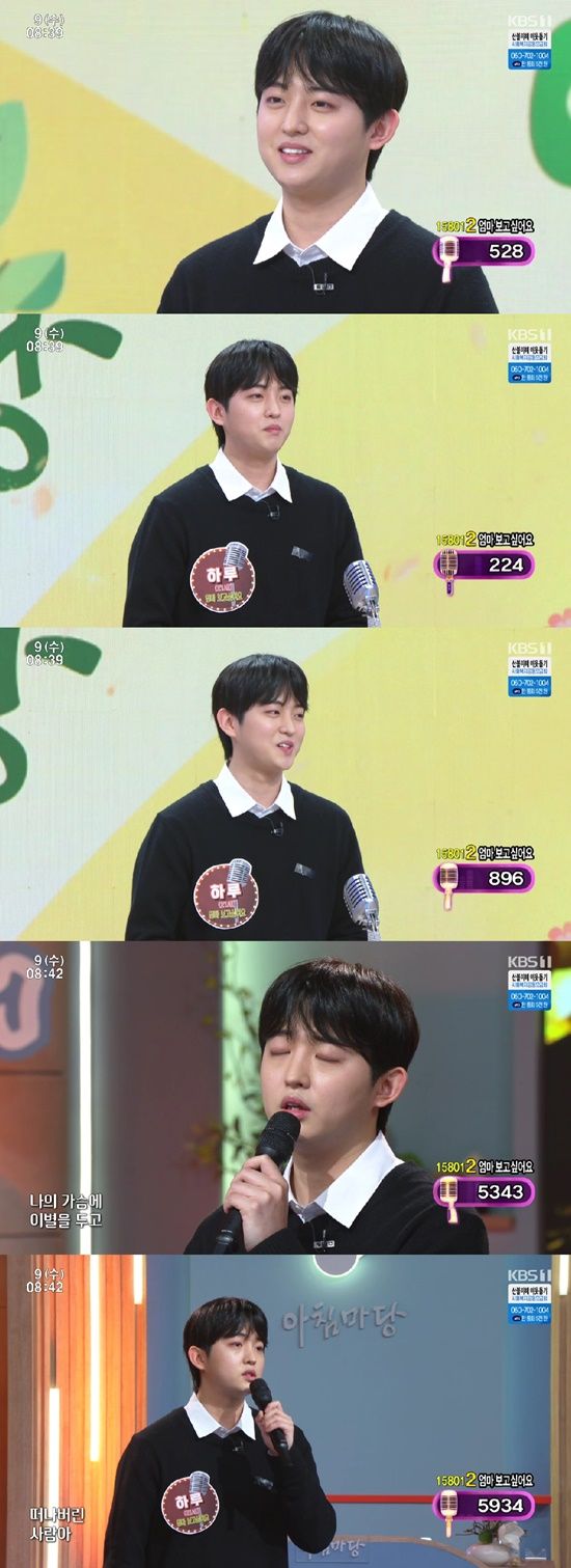 9일 오전 방송된 KBS 1TV '아침마당' 도전 꿈의 무대 코너에는 하루가 도전가수로 출연했다.