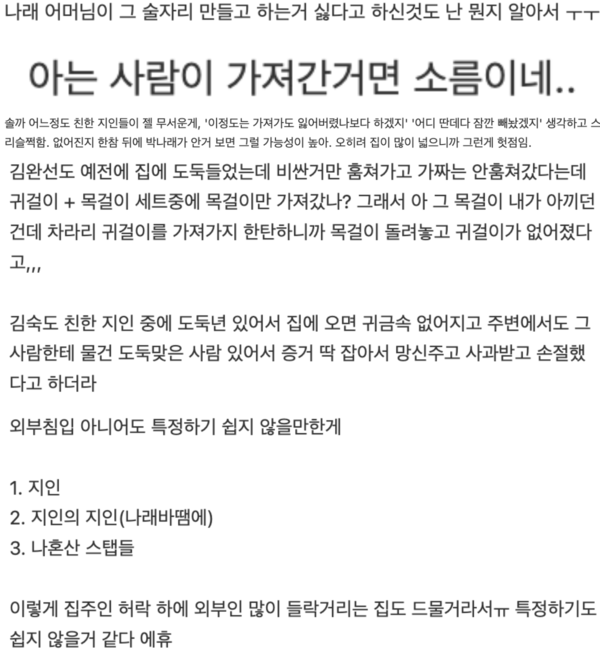 특히 박나래는 과거 방송에서 무단침입이나 사생활 침해로 인한 고통을 토로한 적이 있어, 이번 사건이 더욱 큰 공분을 일으키고 있다.