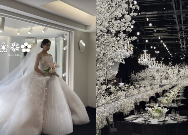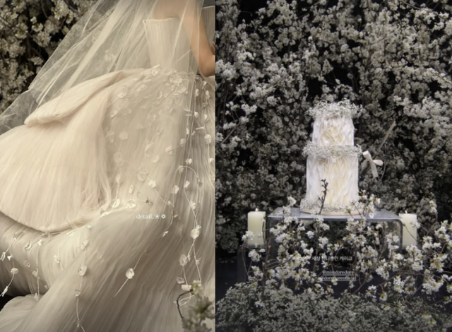 사진 속엔 드레스 피팅 현장부터 웨딩케이크, 답례품 등 결혼식 구석구석이 담겨있다. 먼저 효민이 입은 풍성한 회오리 베일을 특징으로하는 드레스가 눈길을 끈다. 해당 드레스는 국내 단 두 벌 뿐인 하이엔드 브랜드 제품으로 알려졌다.