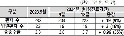특히 중증수술은 3.7만 건으로 비상진료기간인 9월 대비 35% 증가했다. 비중증 환자는 종합병원을 이용하면서 종합병원 이상의 전체 환자 수는 전년과 유사한 수준을 유지했다.