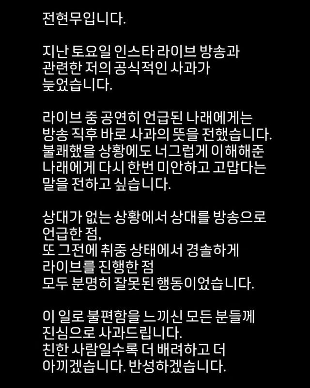 9일 전현무는 소셜미디어(SNS)에 “지난 토요일 인스타 라이브 방송과 관련한 제 공식 사과가 늦었다”며 "나래에게 즉시 사과의 뜻을 전했다. 불쾌했을 상황에도 너그럽게 이해해 준 나래에게 미안하고 고맙다"고 전했다.