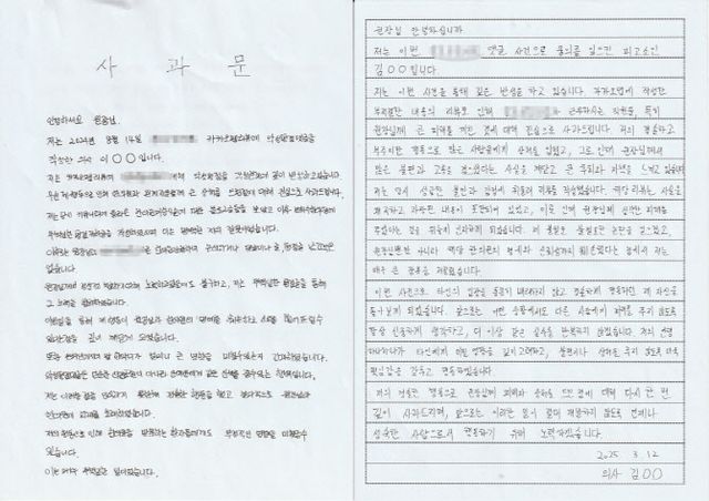 두 사람은 각각 반성문에서 자신들을 ‘악성 평점 댓글을 작성한 의사’, ‘A 한의원 댓글 사건으로 물의를 일으킨 피고소인’이라고 한 뒤 “무책임한 평가 저하 글을 작성했다”, “명백한 저의 잘못이다”, “사과드린다”는 등 내용을 적었다.