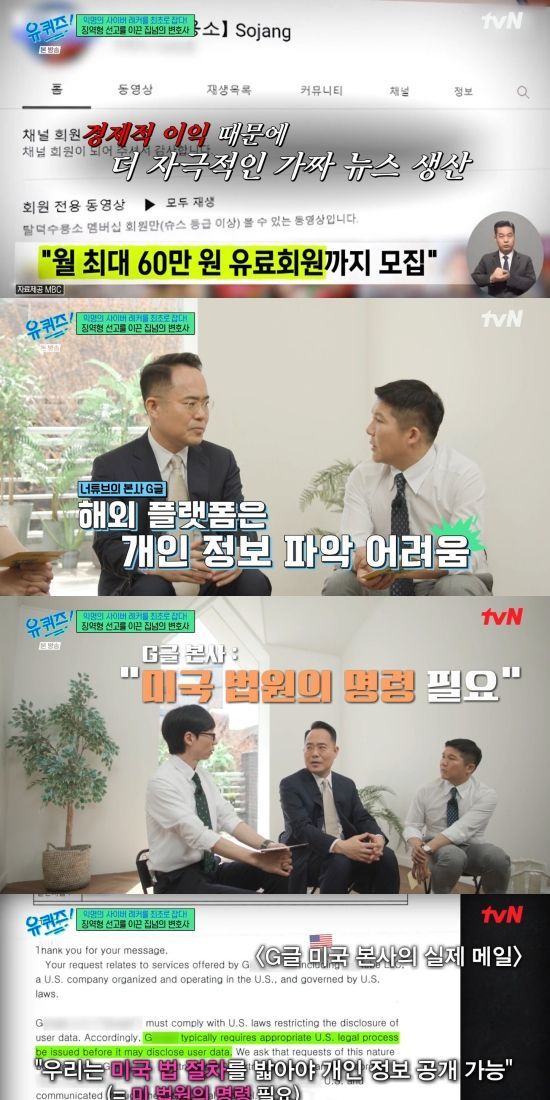 이날 유재석은 "운영자를 잡으려면 (구글) 미국 본사의 협조가 필요한 거 아니냐"라며 물었고, 정경석 변호사는 "반드시 필요하다. 국내 지사들이 다 있으니까 국내 지사에 법원을 통해서 요청을 보내면 '서비스 주체가 아니다. 정보에 대한 접근 권한이 없다. 그러니까 미국 본사로 연락해 보시길 바란다'라고 한다. 여러 가지 노력을 하다가 미국 본사로 메일을 보내서 회신을 받긴 했다. 기본적으로는 미국 법원의 명령이 있어야 (신원 정보를) 줄 수 있다는 거다"라며 밝혔다.