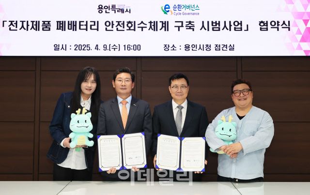 10일 경기 용인시에 따르면 시와 E-순환거버넌스는 지난 9일 용인시장 접견실에서 ‘전자제품 폐배터리 안전 회수 체계 구축 시범 사업’ 추진을 위한 업무협약을 체결했다.