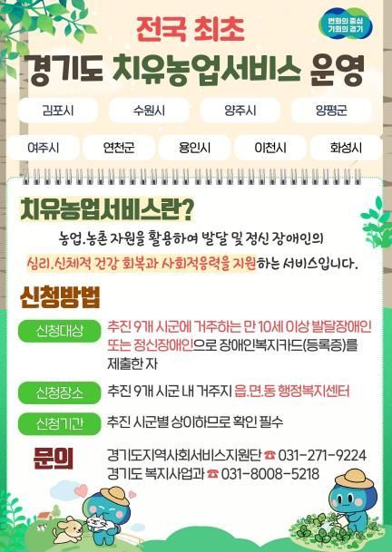 도는 지역사회서비스 투자사업의 하나로 지난 2023년부터 농업과 복지를 연계한 치유농업서비스를 개발, 전국 최초로 운영해 오고 있다. 지역사회서비스 투자사업은 지역 주민의 다양한 욕구 충족을 위해 필요한 사회서비스를 지자체에서 발굴·기획해 제공하는 사업이다.