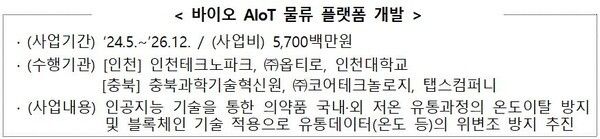 이와 함께 인천시는 산업 인공지능 전환(AX)과 관련한 국가 공모사업에도 적극적으로 참여하고 있다. 2024년 5월에는 과학기술정보통신부의 ‘지역 자율형 디지털 혁신 프로젝트’에 선정되어, 2026년까지 인공지능 기반 ‘바이오 인공지능사물인터넷(AIoT) 물류 플랫폼 개발’ 과제를 수행 중이다.