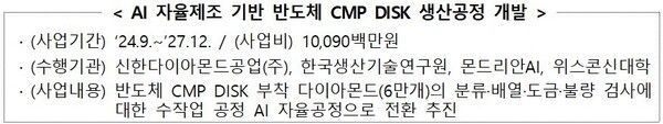 이어, 2024년 9월에는 산업통상자원부의 ‘인공지능(AI) 자율제조 선도 프로젝트’에 선정되어 2027년까지 ‘인공지능 자율제조 기반 반도체 CMP DISK(화학기계적 연마 디스크) 생산공정 개발’ 과제를 추진하고 있다.