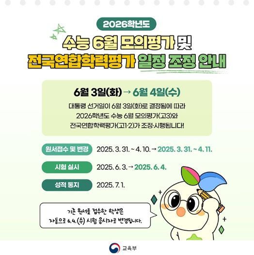 [와이뉴스] 대통령 선거일이 6월 3일(화)로 결정됨에 따라 2026학년도 수능 6월 모의평가(고3)와 전국연합학력평가(고1·2)가 조정·시행된다.