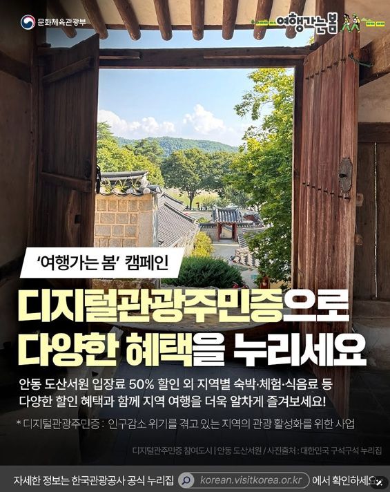 안동 도산서원 입장료 50% 할인 외 지역별 숙박·체험· 식음료 등 다양한 할인 혜택과 함께 지역 여행을 더욱 알차게 즐겨보세요!