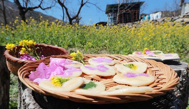 지리산 자락인 경남 함양군 마천면 창원마을에 한 가족이 소소하게 간식으로 만든 화전(진달래, 유채꽃 ,쑥)이 놓여 있다 / 뉴스1(함양군 제공)