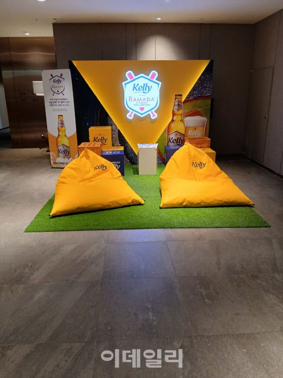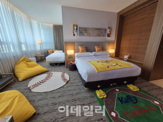[이데일리 노희준 기자] 푸른 야구장을 상징하는 잔디밭 카페트에 사람 크기만 한 노란색 켈리병이 우뚝 솟았다. 옆에는 뜨거운 불방망이를 상장하는듯한 빨간 야구 배트 2개와 물샐 틈 없는 수비를 떠올리는 육각형 방패가 걸렸다. 방패 안에는 하이트진로의 맥주 브랜드 켈리와 호텔 라마단 글자가 찍혔다. 가장 좋은 객실 안으로 들어서자 침대 옆에 놓인 커다란 야구공 카페트와 야구장 카페트가 눈길을 가로챈다.