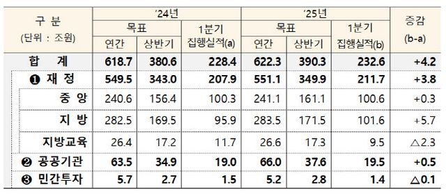 김 차관은 “경기 회복을 뒷받침하기 위해 올해는 역대 최고 수준의 상반기 신속집행(중앙재정 67%) 목표를 세웠다”며 “도전적인 목표를 달성하기 위해 매주 점검회의를 열고 주요 집행 현장을 점검하는 등의 노력을 기울인 결과 1분기 재정·공공기관·민간투자 집행액은 전년동기대비 4조 2000억원 증가한 232조 6000억원(잠정)을 달성했다”고 밝혔다.