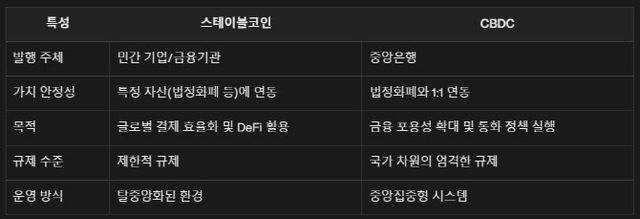 또 미국이 도널드 트럼프 미국 대통령 취임 이후 친가상자산정책으로 USD1과 같은 달러 기반 스테이블코인 발행을 강화하는 상황에서 성격이 완전히 다른 CBDC를 하는 게 맞지 않다고 보는 분석도 있다. 스테이블코인은 CBDC와 달리 민간기업이나 금융기관이 발행할 수 있고,탈중앙화된 환경에서 특정자산에 연동돼 운영된다는 점에서 강력한 활성화 정책을 추진하고 있다. 트럼프 대통령 가족이 지원해 발행하는 ‘월드리버티파이낸셜’의 USD1이 대표적인 사례다.