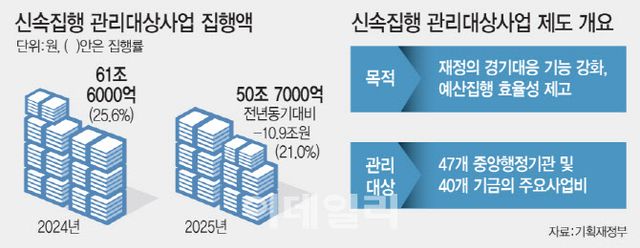 신속집행 관리대상사업(중앙재정)만 놓고 봐도 1~2월 누계 지출은 50조 7000억원으로 전년 동기 대비 10조 9000억원 줄었다. 집행률도 21.0%로 전년대비 4.6%포인트 낮은 수준이다. 작년엔 ‘상고하저’ 흐름을 보일 것이란 경기 전망에도 1분기 지출이 많았다는 비판이 있었던 시기다.