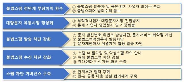 과기부는 ▲부적격 사업자 대량문자시장 진입 방지 ▲불법스팸 악성문자 발송 차단 ▲식별체계 활용 발송‧차단 ▲해외발 대량문자 사전차단 등의 추진 현황을 발표했다.