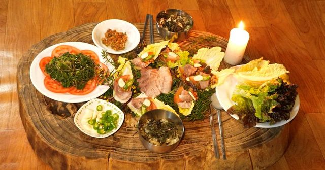 산에서 직접 캔 나물무침에 직접 캐서 말린 나물로 만든 나물밥, 그리고 산수유 꽃으로 멋을 낸 수육까지!