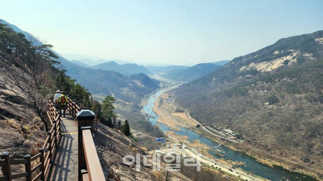 | 섬진강변에 자리한 전북 순창 용궐산 하늘길의 모습. 이름처럼 산은 장대하고 기세는 생동감 넘친다. 산 중턱에는 크고 가파른 암벽이 버티고 있는데 감히 오를 엄두가 나지 않을 만큼 험준하다. 순창군은 2000년 이곳에 1㎞ 남짓한 ‘하늘길 탐방로’를 조성하면서 순창의 새로운 랜드마크가 됐다. |