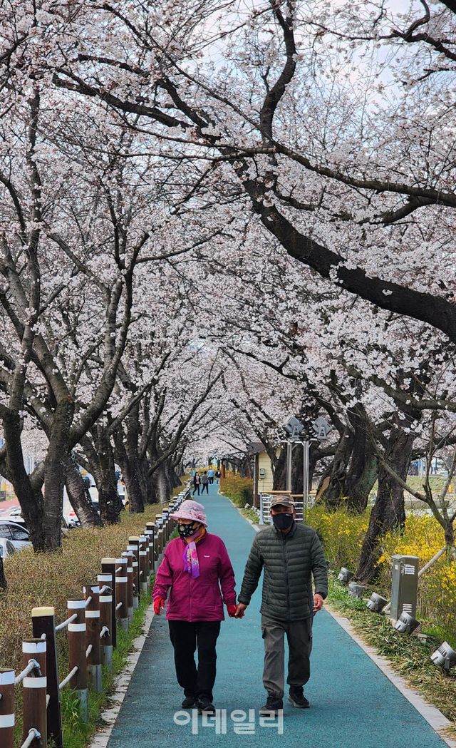 | 전북 순창 읍내를 가로지르는 섬진강 지류인 양지천은 이미 벚꽃이 만개했다. |