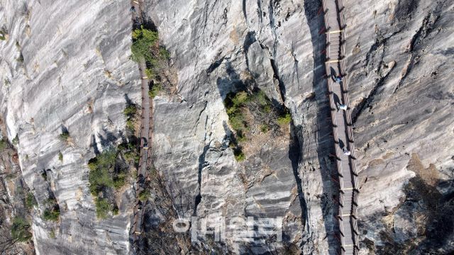 산 중턱에는 크고 가파른 암벽이 버티고 있다. 감히 오를 엄두가 나지 않을 만큼 험준했다. 2020년 순창군이 1㎞ 남짓한 ‘하늘길 탐방로’를 조성하면서 사정이 달라졌다. 용궐산 자연휴양림에서 시작한 탐방로는 약 2시간 코스(왕복 3.2㎞)로 하늘길 끝자락에 있는 ‘비룡정’까지 걷는 것이 일반적이다.